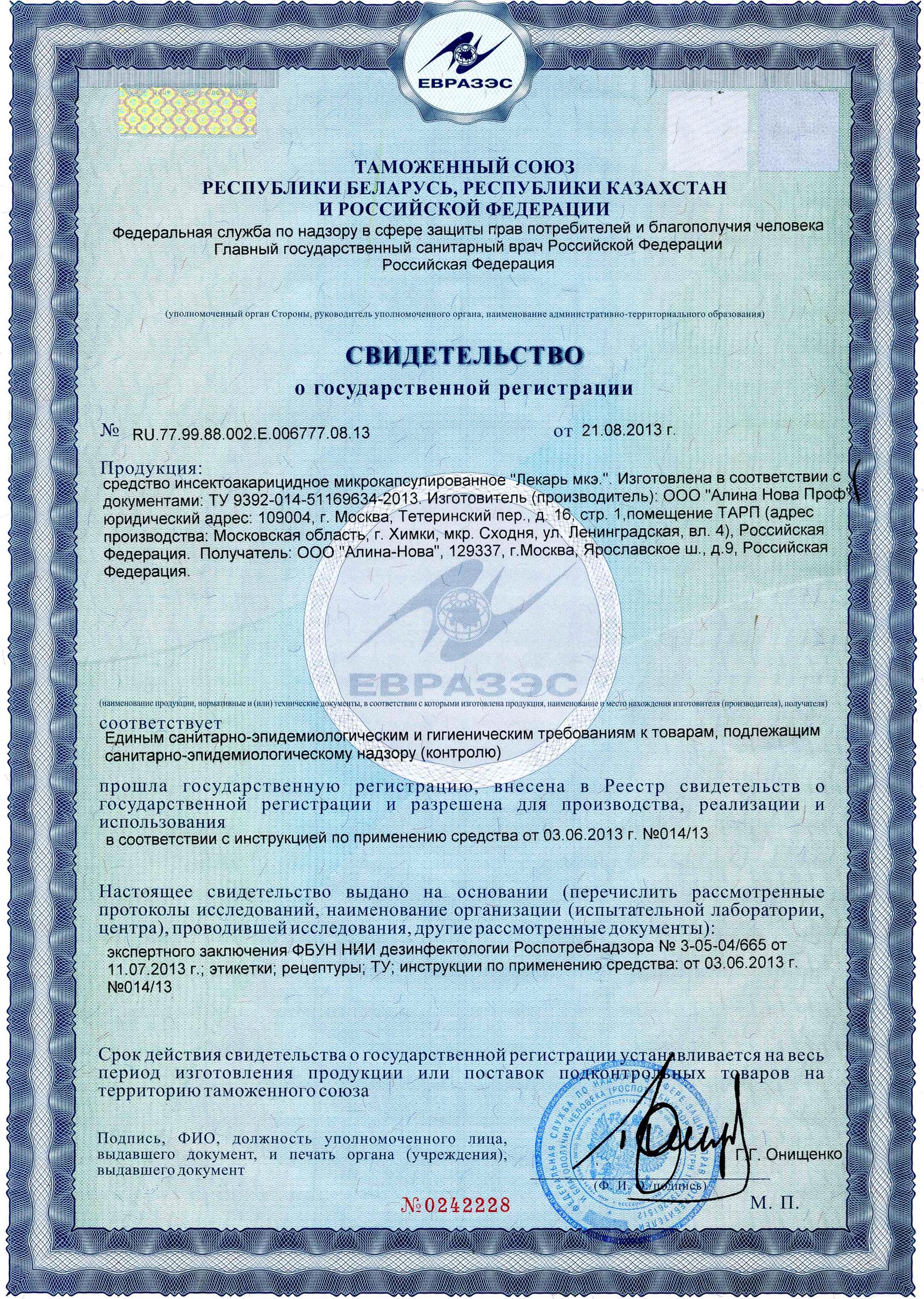 Свидетельство о госрегистрации в Таможенном Союзе