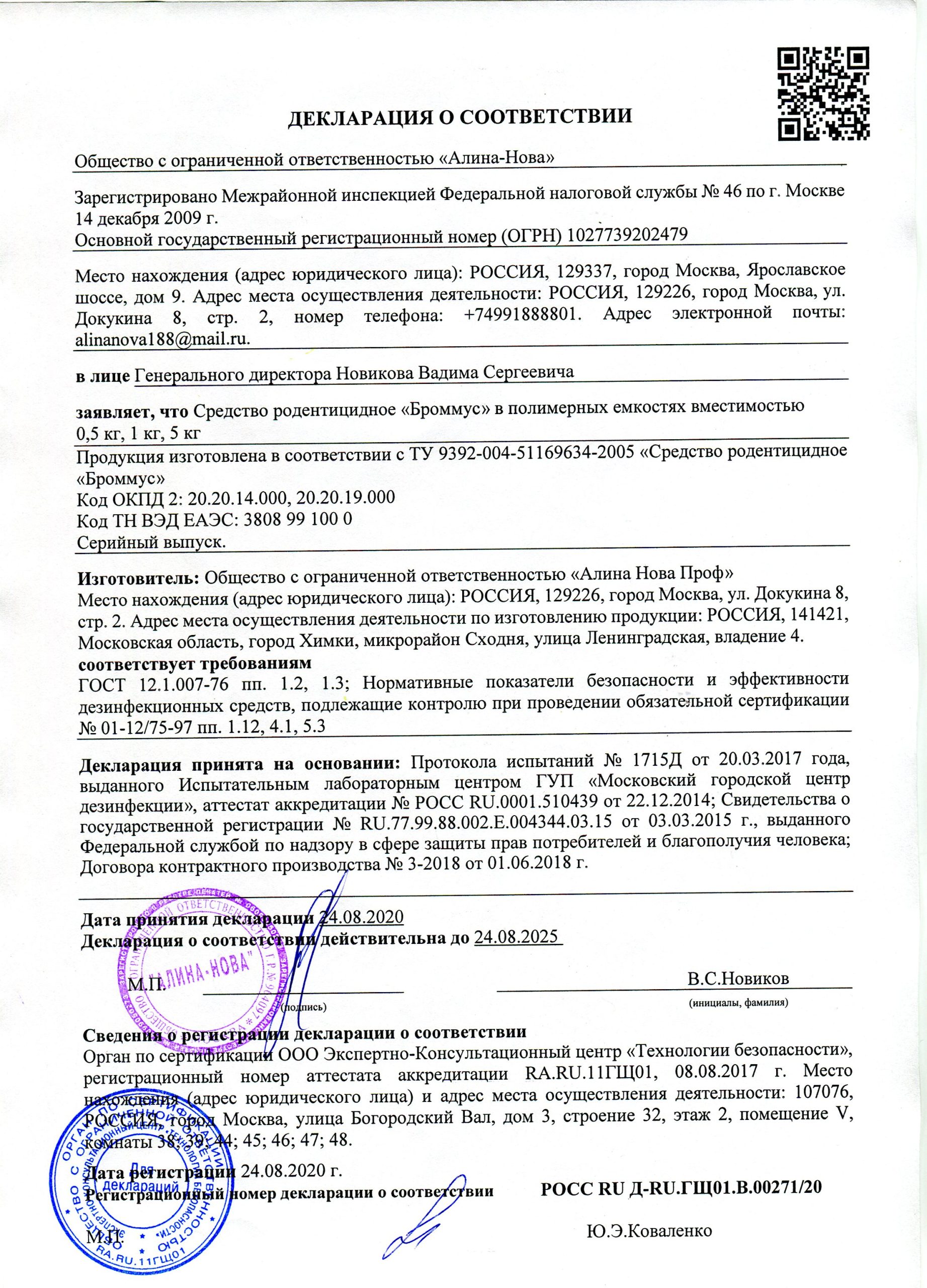 Средство предназначено для приготовления и применения профессиональным контингентом отравленных приманок для уничтожения крыс и мышей на объектах различных категорий. В состав входит битрекс (горький компонент), предохраняющий приманки на основе «БРОММУСа» от поедания птицами и снижающий опасность случайного перорального отравления людей и нецелевых видов животных. Препарат вызывает понижение свертываемости крови, а через 5-9 суток приводит к гибели грызунов. Для надежного прокрашивания пищевой основы введены самые современные красители.